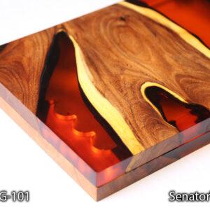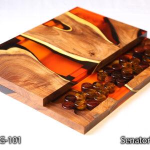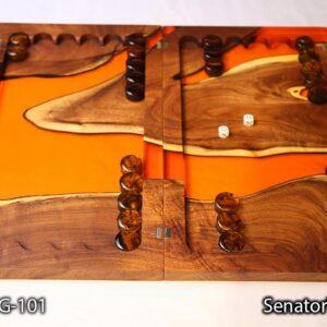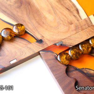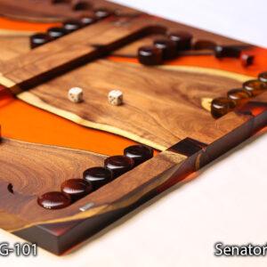تخته نرد Senator Wood مدل BG-101 تجلی قدرت و زیبایی است. ما در خلق این اثر هنری از چوب کهور (Mesquite) بهره بردهایم. کهور یکی از متراکمترین و سنگینترین چوبهای دنیاست که رنگ قهوهای تیره و بافت بسیار فشردهای دارد. اما جادوی اصلی زمانی رخ میدهد که این چوب اصیل در کنار رزین اپوکسی با رنگ نارنجی پرتقالی (Amber Orange) قرار میگیرد.